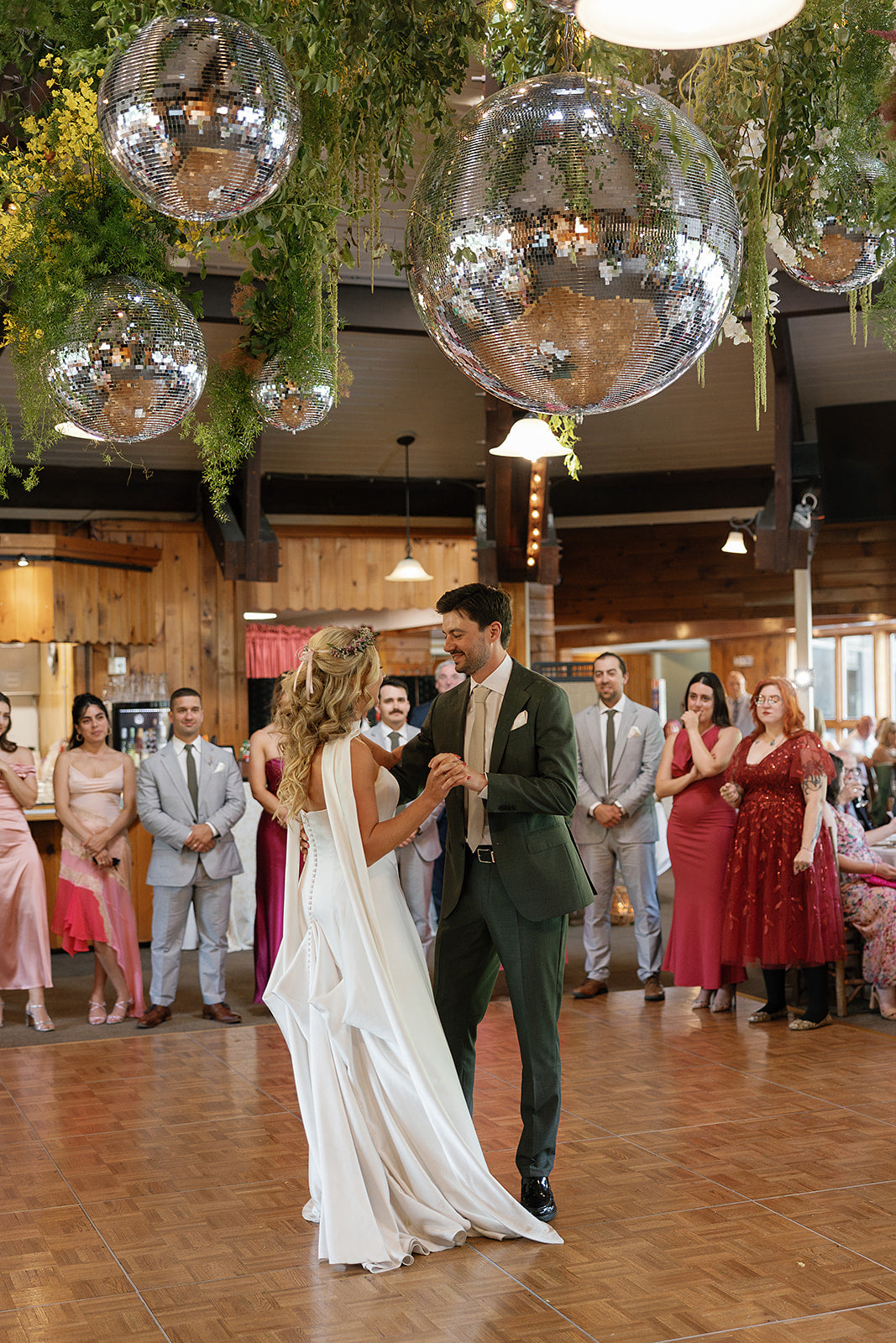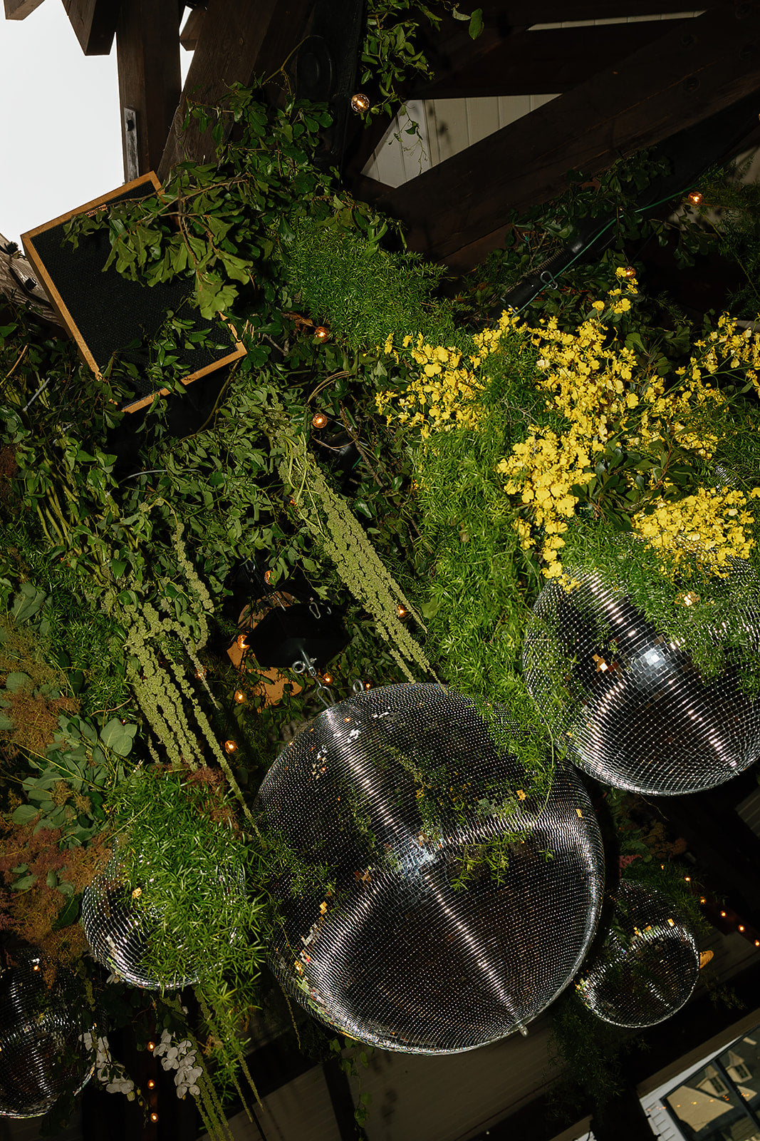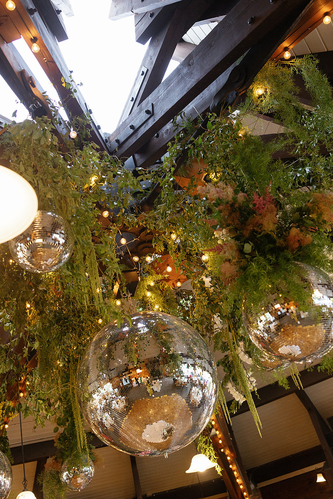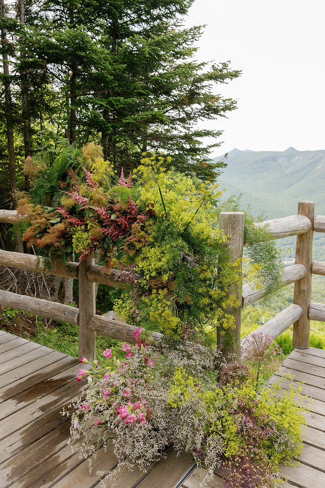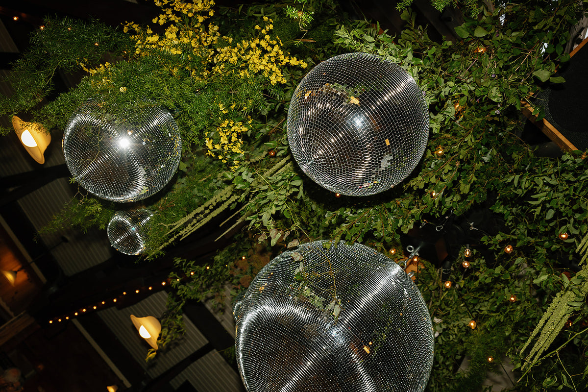 A mountaintop ceremony nestled among the trees, where florals were designed to feel as though they belonged - enhancing the landscape without competing with it. For the reception, a disco ball + greenery canopy set the tone for the party in the lodge, accented with tabletop vignettes. The result was nothing short of magic. Planning by Liz M. Pruitt Events. Photography by Emily Boudreau.
