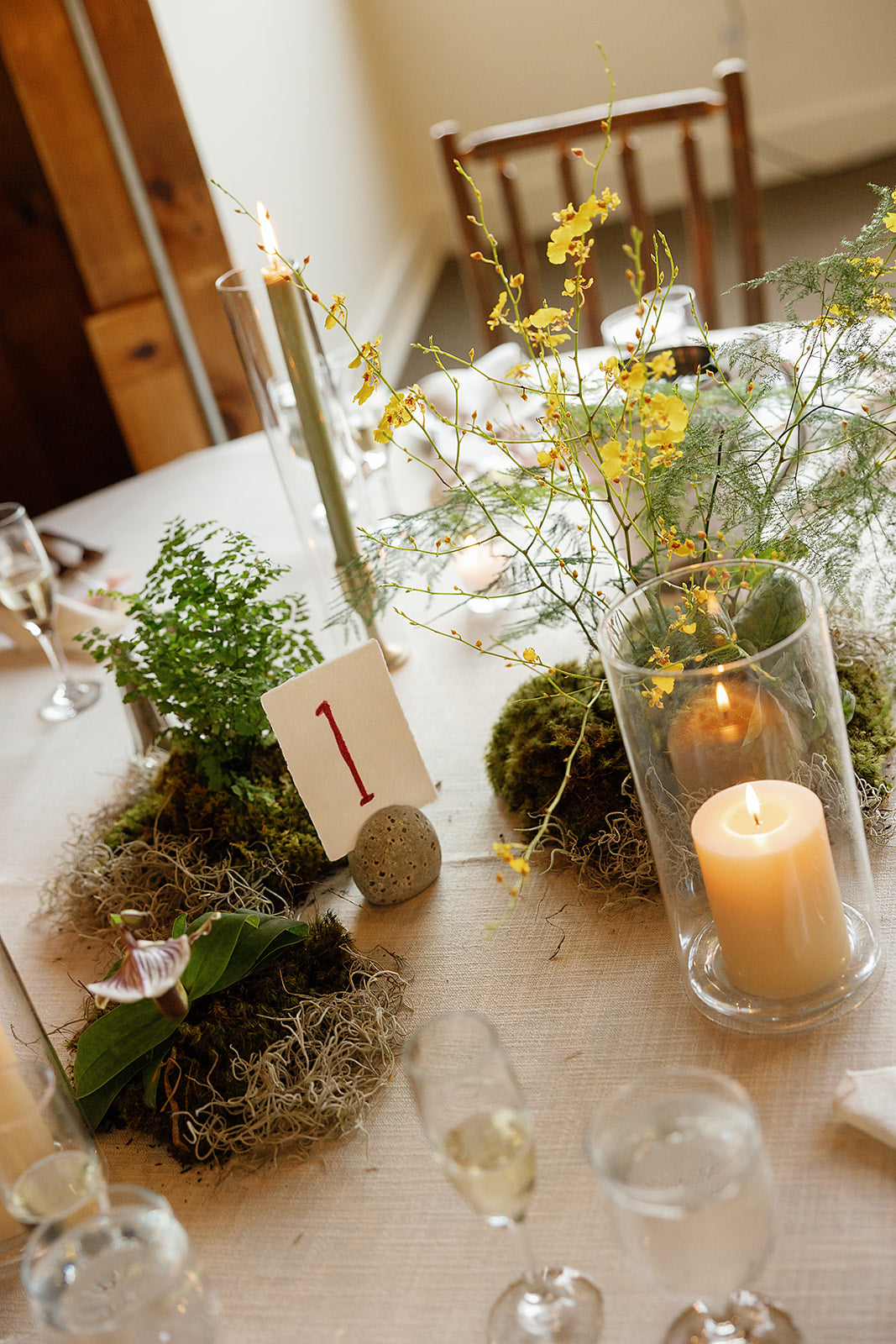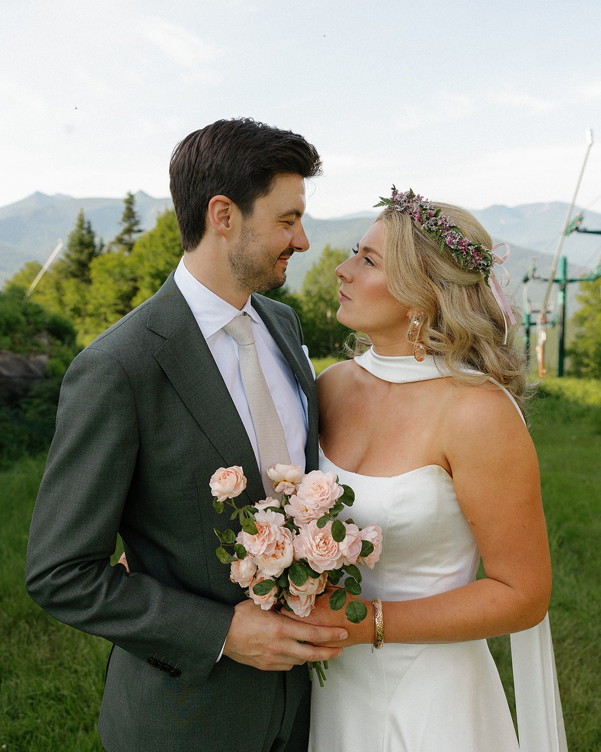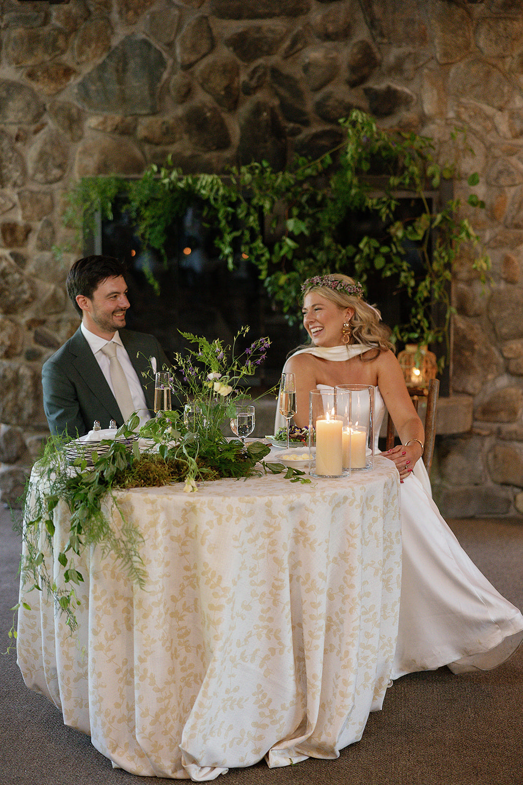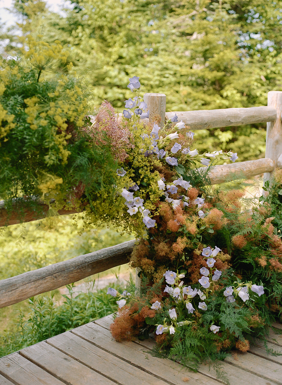 A mountaintop ceremony nestled among the trees, where florals were designed to feel as though they belonged - enhancing the landscape without competing with it. For the reception, a disco ball + greenery canopy set the tone for the party in the lodge, accented with tabletop vignettes. The result was nothing short of magic. Planning by Liz M. Pruitt Events. Photography by Emily Boudreau.