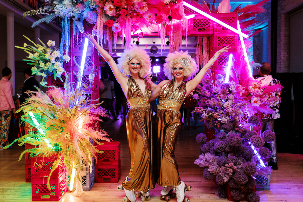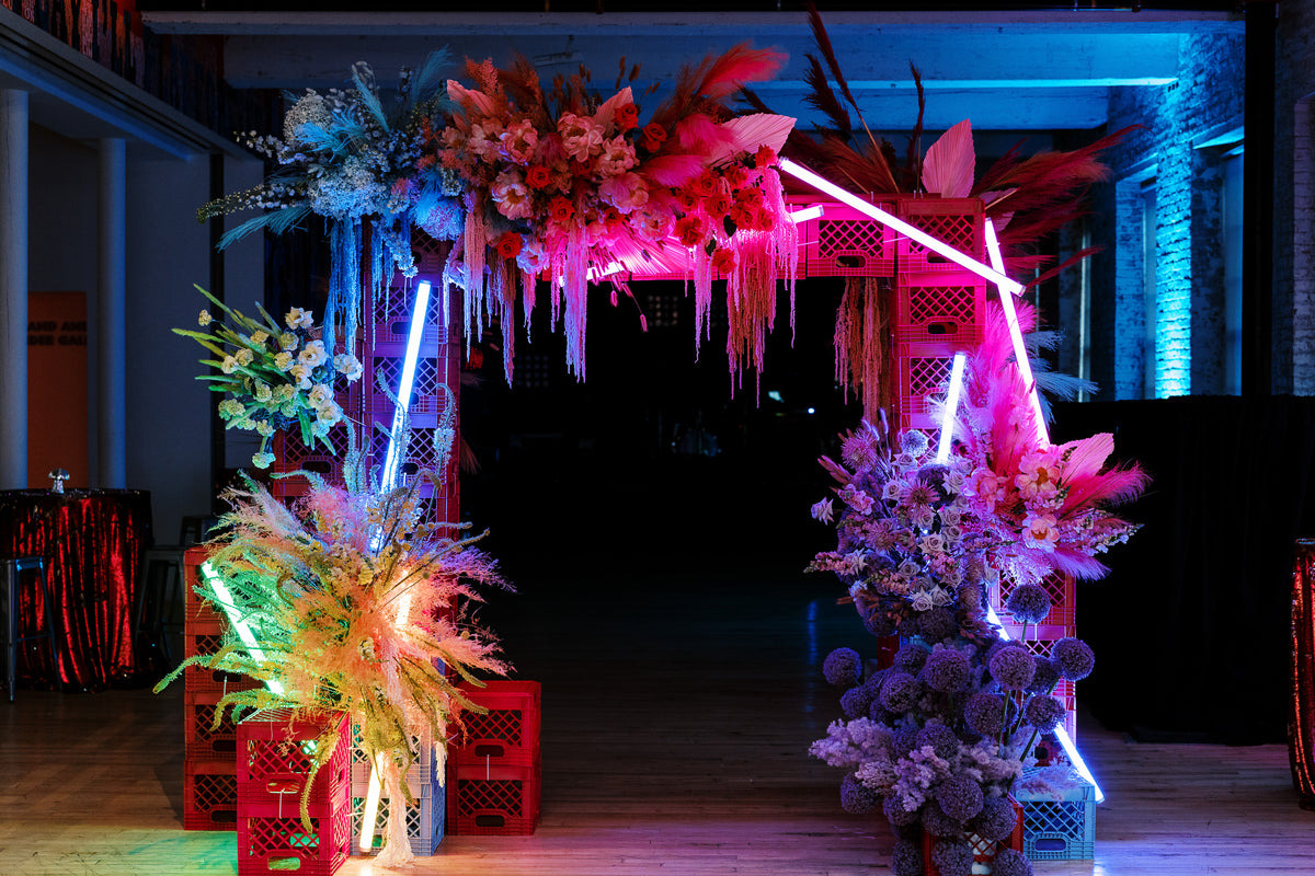 A Neon Disco Floral Arch Installation for a fantastic 40th birthday celebration at Mass MoCA with planner AE Events and photography by Nicole Baas.