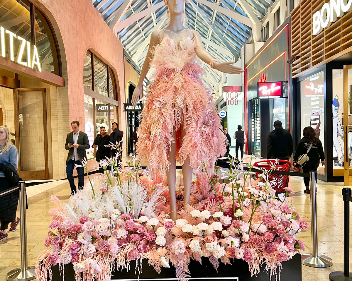 When Fleur de Villes arrived in Boston, we styled a mannequin as if she were dressed in Rococo. She welcomed visitors into the Prudential Center and softened the hum of the city with a whimsical presence that felt almost dreamlike. Designed from all real and preserved florals using sustainable mechanics only.